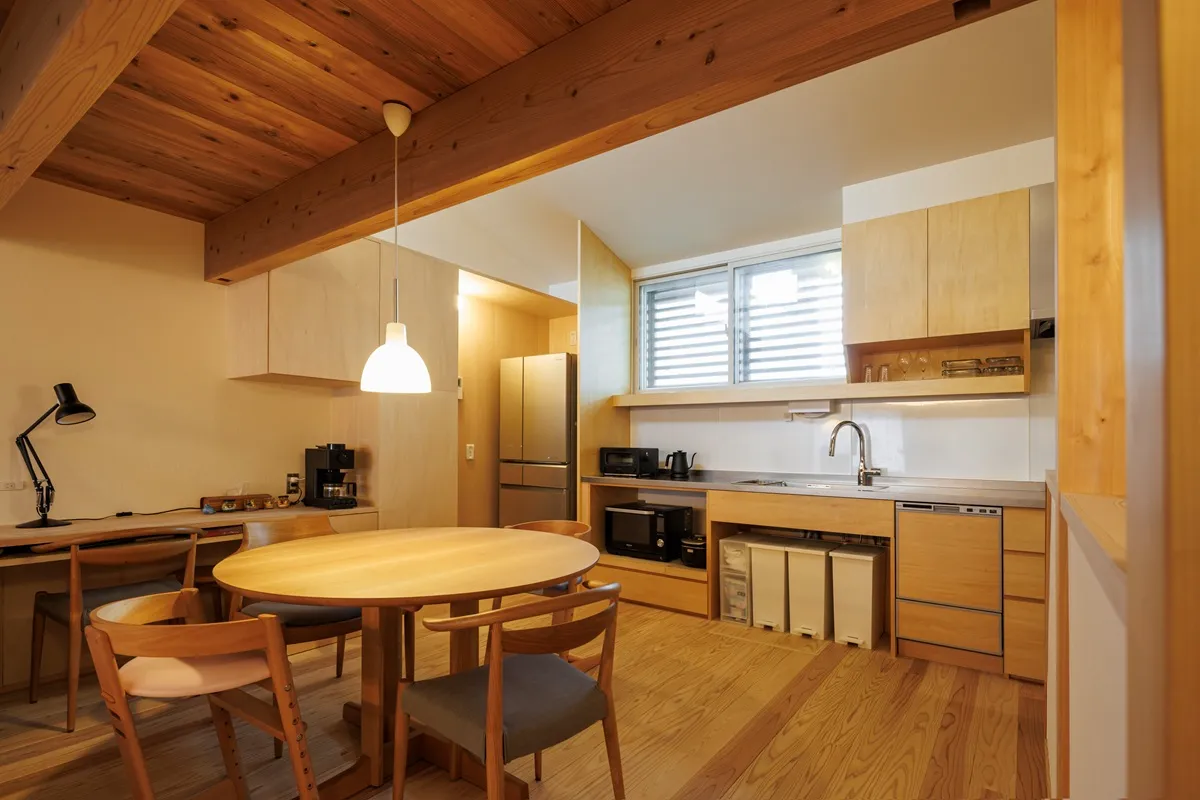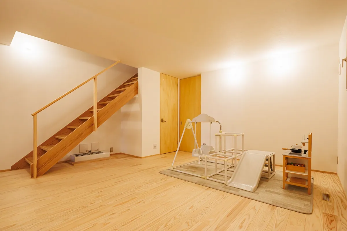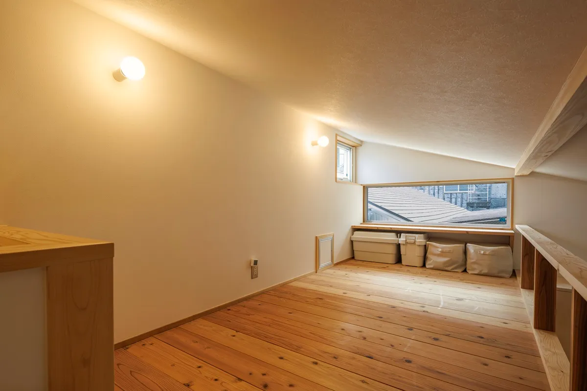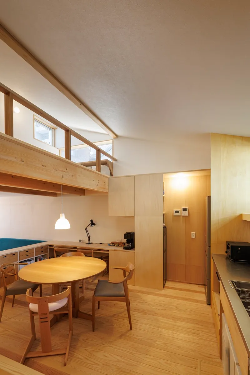 二階リビングはダイニングのペンダントライトと間接照明で空間をデザインし、家族だけのほっと落ち着けるリビングを作りました。コンパクトでありながら、小下がりを作ることでゆるくゾーニングする効果もあり、座れる居場所がたくさんできました。