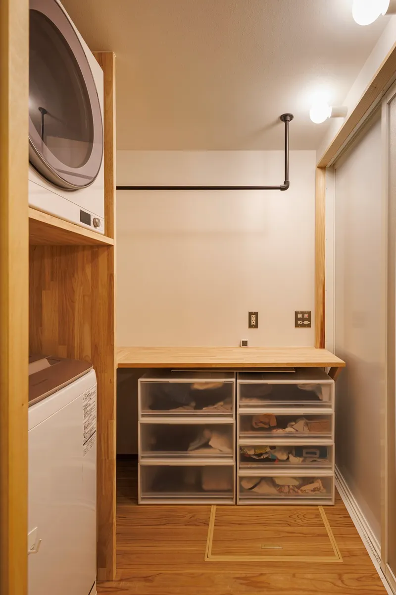 コンパクトなお家で不安な収納計画。お施主様の現在お持ちのモノの量を細かくヒアリングさせていただき、造り付けの収納をご提案しました。他に収納家具を置かなくても済む収納量と、暮らしの空間を圧迫しない割合を検討しながら設計しています。