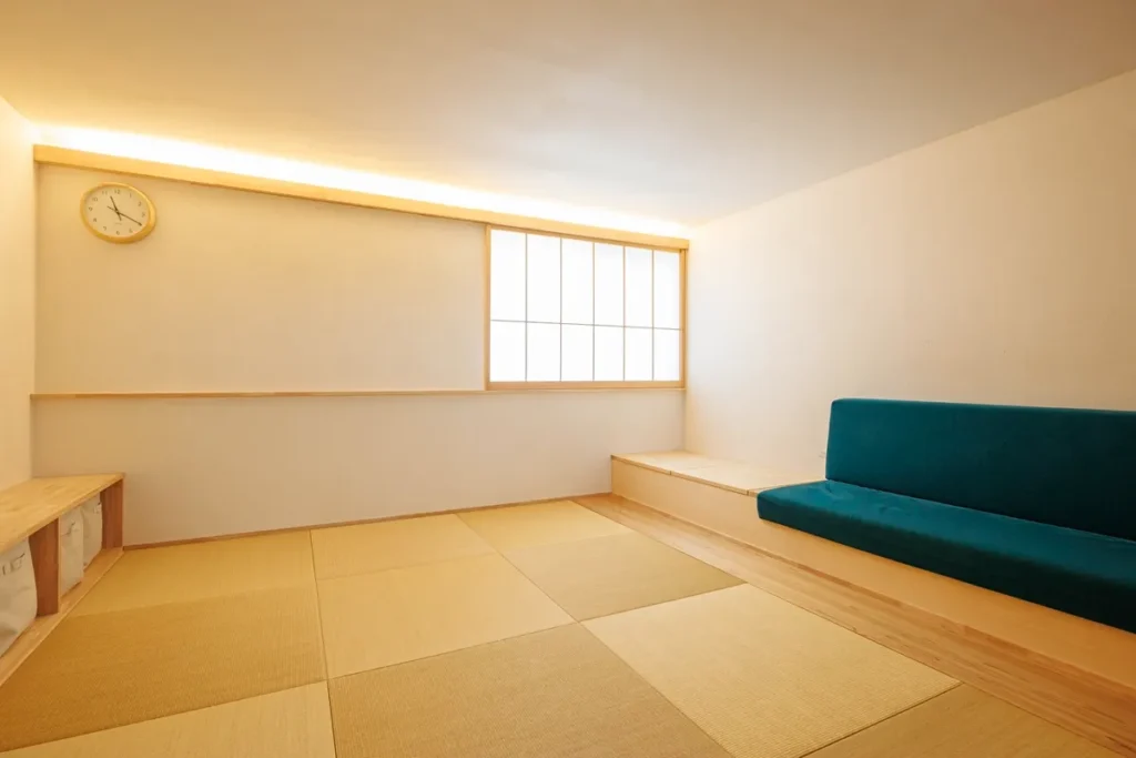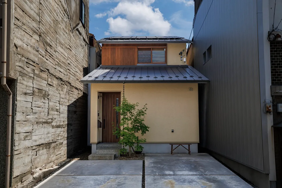 両隣にビルが建つ影の多い土地だったため、外壁のそとん壁は少し明るめの色を採用しました。サンプルでは明るいイエローに見えましたが、完成した建物を見ると、影が入り和モダンに丁度良い落ち着いた色になっているかと思います。