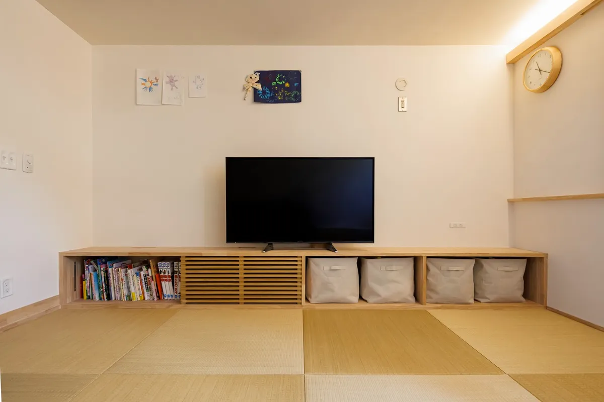 2階リビングの造作収納は、ご希望の雑貨や家電がぴったり納まるよう、お施主様と何度も打ち合わせを重ねました。漆喰と木の優しい色合いの中に置かれた青いソファが、良いアクセントになっています。