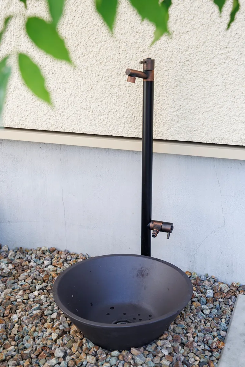 そとん壁と木格子で和モダンなデザインです。狭小地かつ両隣の建物はギリギリまで迫っている敷地の中で、将来のメンテナンスに支障がない範囲で敷地をいっぱいに使って家を設計しました。人通りを気にせず過ごせる二階リビングをご提案し、一階の道路面には窓を設けず植栽が映える壁としました。